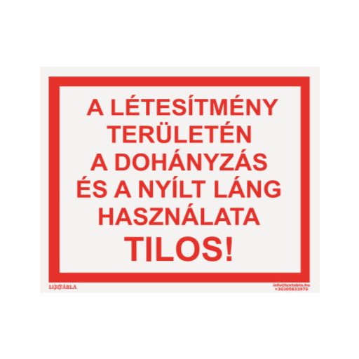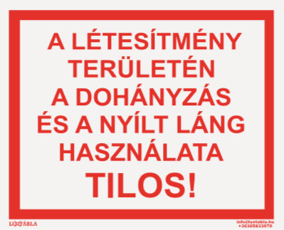 A Luxtábla – A létesítmény területén a dohányzás és a nyílt láng használata tilos! felirat egyértelmű és jól látható jelölést biztosít a tűzvédelmi előírások, figyelmeztetések vagy vészhelyzeti információk feltüntetésére. A tábla segíti az épületben tartózkodók gyors tájékozódását, valamint hozzájárul a tűzvédelmi szabályok betartásához.