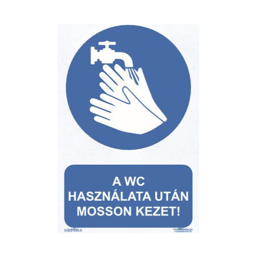 A Luxtábla A wc használata után mosson kezet! piktogram + felirat szabványos, jellemzően kék–fehér – színvilággal készül, amely biztosítja a gyors felismerhetőséget és az egyértelmű üzenetátadást.
