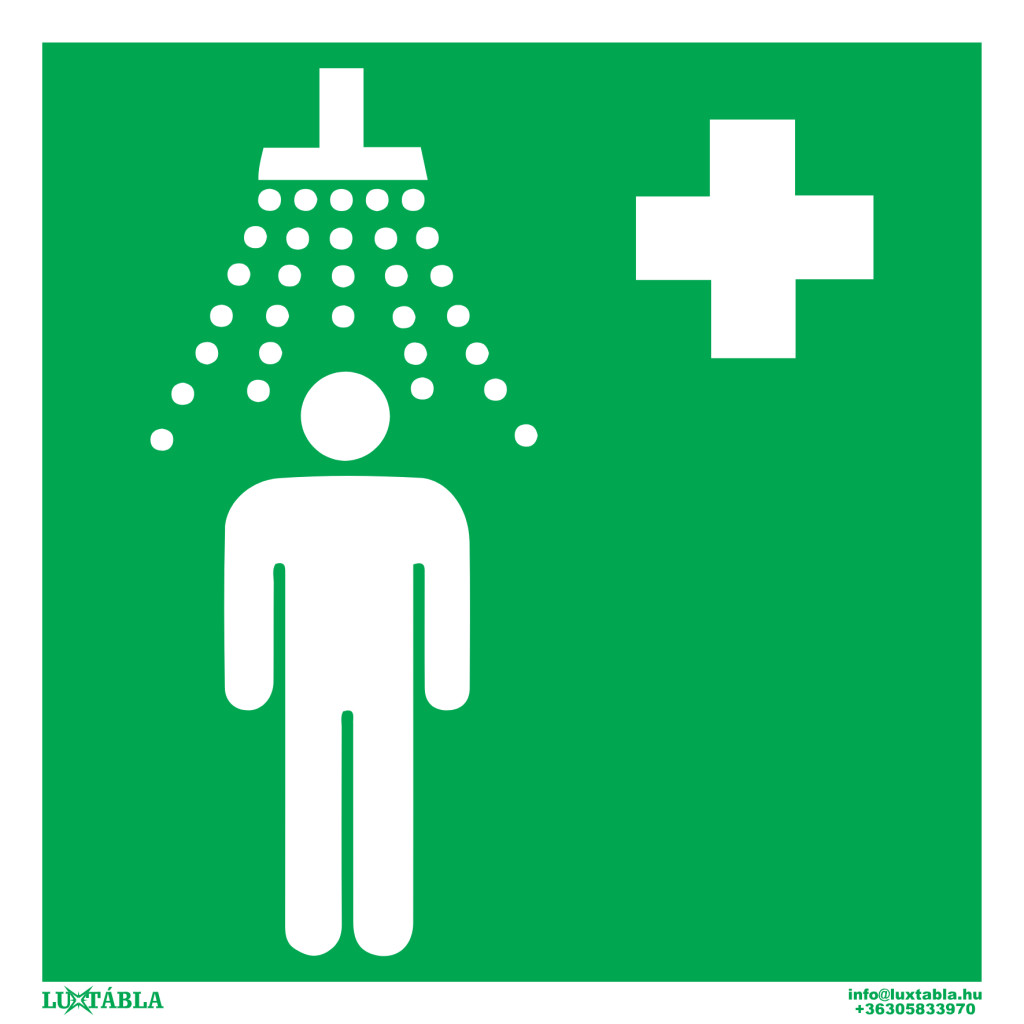 A Luxtábla Biztonsági zuhany jelölő piktogram szabványos, jellemzően zöld–fehér színvilággal készül, amely biztosítja a gyors felismerhetőséget és az egyértelmű üzenetátadást.