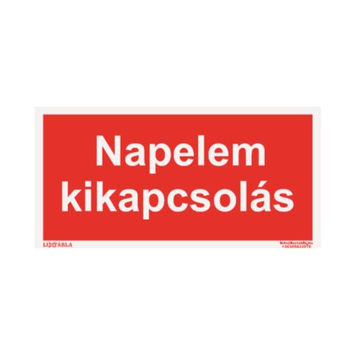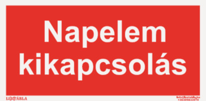 A Luxtábla – Napelem kikapcsolás felirat egyértelmű és jól látható jelölést biztosít a tűzvédelmi előírások, figyelmeztetések vagy vészhelyzeti információk feltüntetésére. A tábla segíti az épületben tartózkodók gyors tájékozódását, valamint hozzájárul a tűzvédelmi szabályok betartásához.