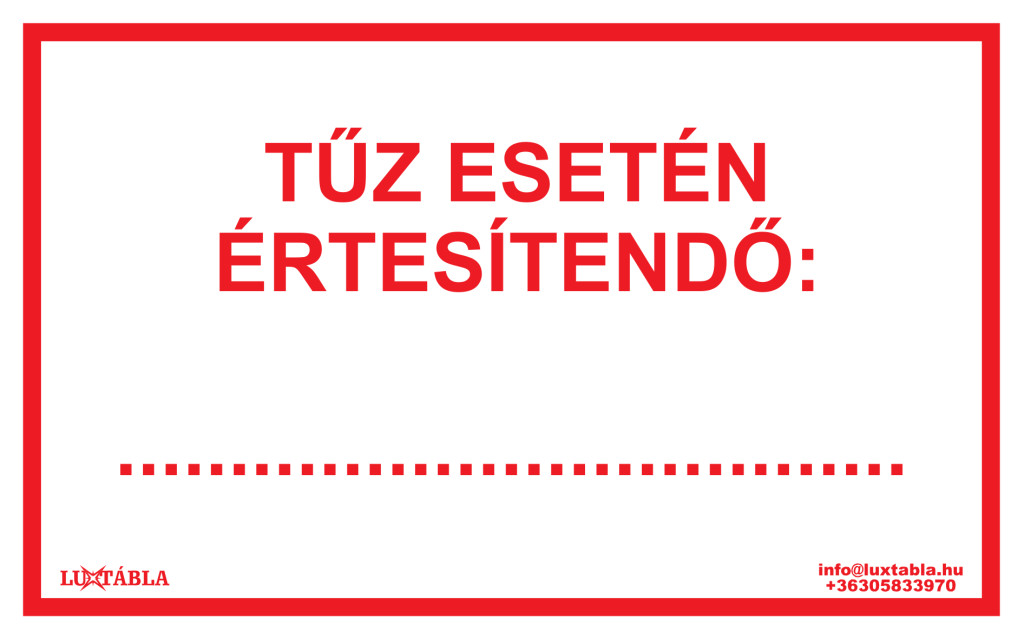A Luxtábla – Tűz esetén értesítendő felirat egyértelmű és jól látható jelölést biztosít a tűzvédelmi előírások, figyelmeztetések vagy vészhelyzeti információk feltüntetésére. A tábla segíti az épületben tartózkodók gyors tájékozódását, valamint hozzájárul a tűzvédelmi szabályok betartásához.