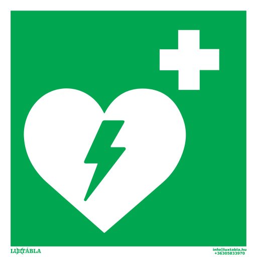 A Luxtábla Defibrillátor jelölő piktogram szabványos, jellemzően zöld–fehér színvilággal készül, amely biztosítja a gyors felismerhetőséget és az egyértelmű üzenetátadást.