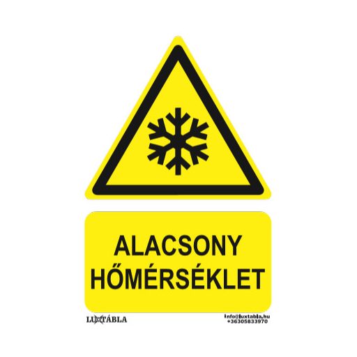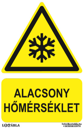 A Luxtábla Alacsony hőmérséklet jelölő piktogram + felirat szabványos – jellemzően sárga–fekete – színvilággal készül, amely biztosítja a gyors felismerhetőséget és az egyértelmű üzenetátadást.