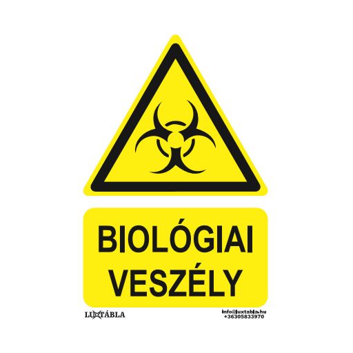 A Luxtábla Biológiai veszély jelölő piktogram + felirat szabványos – jellemzően sárga–fekete – színvilággal készül, amely biztosítja a gyors felismerhetőséget és az egyértelmű üzenetátadást.