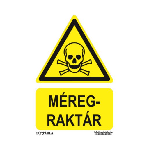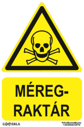 A Luxtábla Méregraktár jelölő piktogram + felirat szabványos – jellemzően sárga–fekete – színvilággal készül, amely biztosítja a gyors felismerhetőséget és az egyértelmű üzenetátadást.
