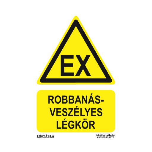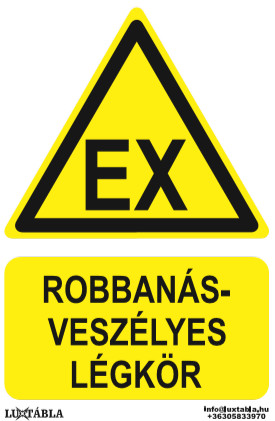 A Luxtábla Robbanásveszély jelölő piktogram + felirat szabványos – jellemzően sárga–fekete – színvilággal készül, amely biztosítja a gyors felismerhetőséget és az egyértelmű üzenetátadást.