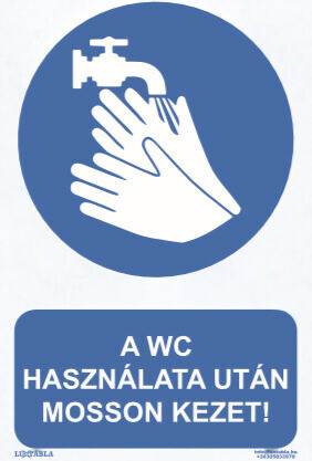 A Luxtábla A wc használata után mosson kezet! piktogram + felirat szabványos, jellemzően kék–fehér – színvilággal készül, amely biztosítja a gyors felismerhetőséget és az egyértelmű üzenetátadást.