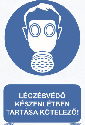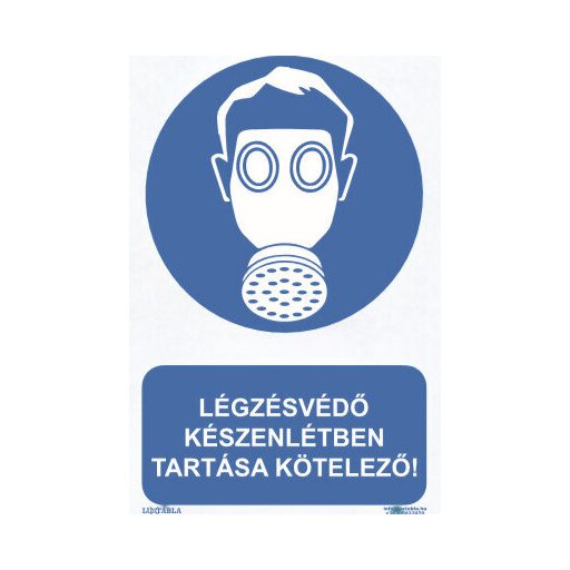 A Luxtábla Légzésvédő készenlétben tartása kötelező! piktogram + felirat szabványos, jellemzően kék–fehér – színvilággal készül, amely biztosítja a gyors felismerhetőséget és az egyértelmű üzenetátadást.