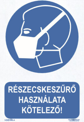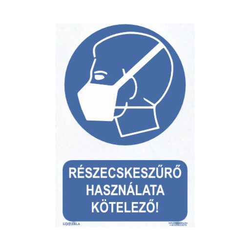 A Luxtábla Részecskeszűrő használata kötelező! piktogram + felirat szabványos, jellemzően kék–fehér – színvilággal készül, amely biztosítja a gyors felismerhetőséget és az egyértelmű üzenetátadást.