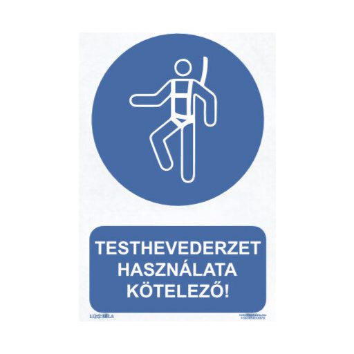A Luxtábla Testhevederzet használata kötelező! piktogram + felirat szabványos, jellemzően kék–fehér – színvilággal készül, amely biztosítja a gyors felismerhetőséget és az egyértelmű üzenetátadást.
