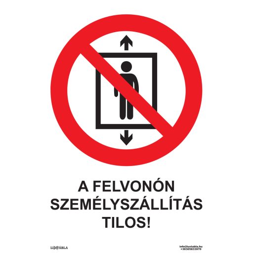 A Luxtábla A teherfelvonón Személyszállítás tilos! piktogram + felirat ideális megoldás minden olyan helyen, ahol fontos a szabványos, jól látható tiltó jelzés egyértelmű megjelenítése és a veszélyes vagy nem megengedett tevékenységek hatékony megelőzése.