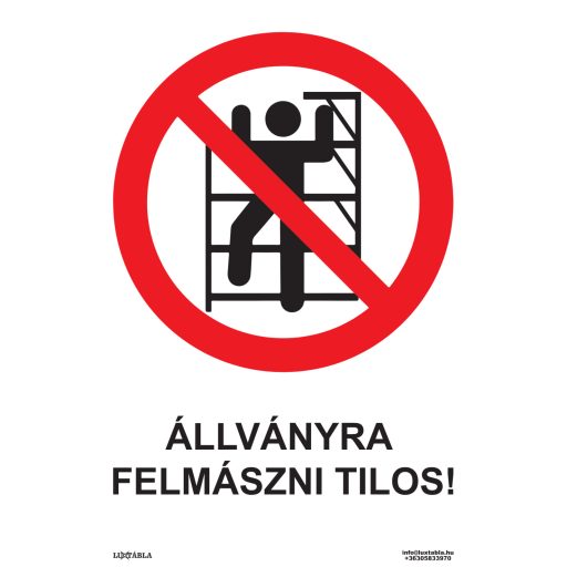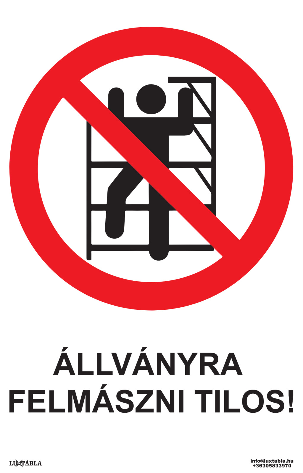 A Luxtábla Állványra felmászni tilos! piktogram + felirat szabványos piros–fehér–fekete színvilággal készül, amely biztosítja a gyors felismerhetőséget és az egyértelmű üzenetátadást.