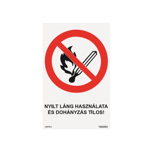 A Luxtábla Nyílt láng használata és dohányzás tilos! piktogram + felirat szabványos piros–fehér–fekete színvilággal készül, amely biztosítja a gyors felismerhetőséget és az egyértelmű üzenetátadást.