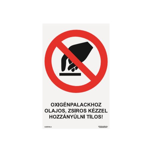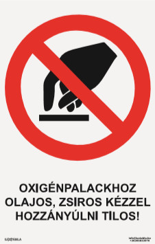 A Luxtábla Oxigénpalackhoz olajos, zsíros kézzel hozzányúlni tilos! piktogram + felirat szabványos piros–fehér–fekete színvilággal készül, amely biztosítja a gyors felismerhetőséget és az egyértelmű üzenetátadást.